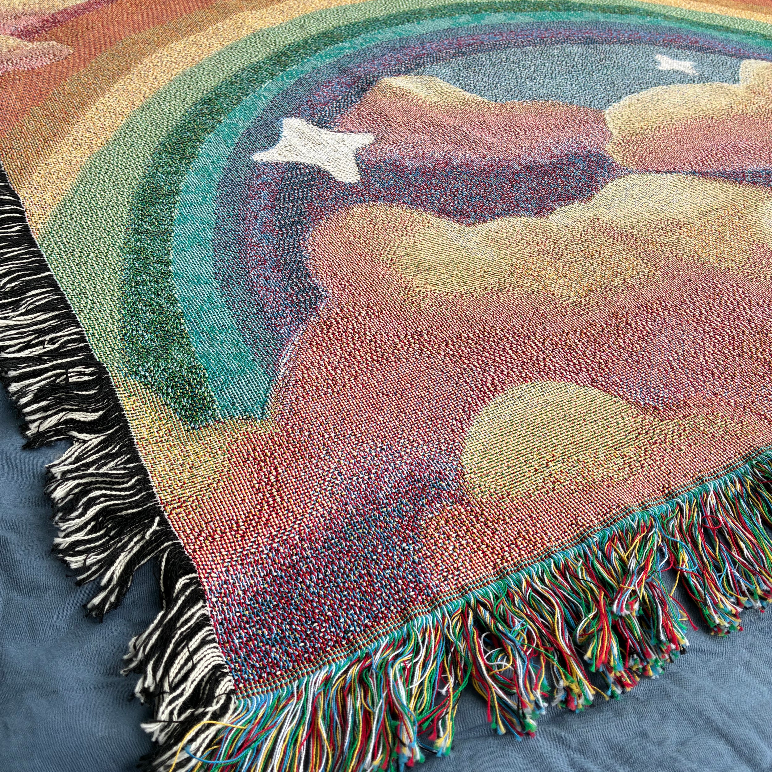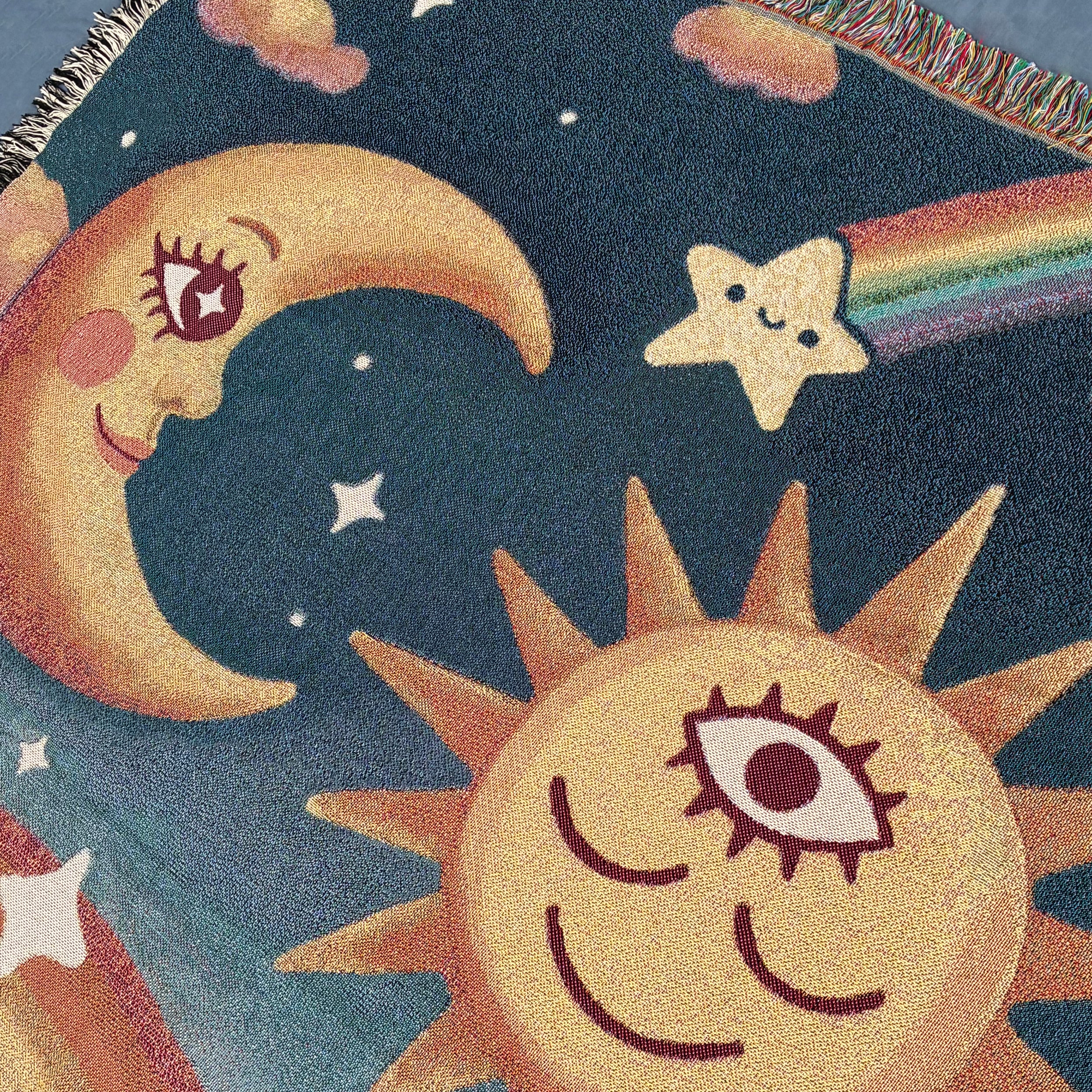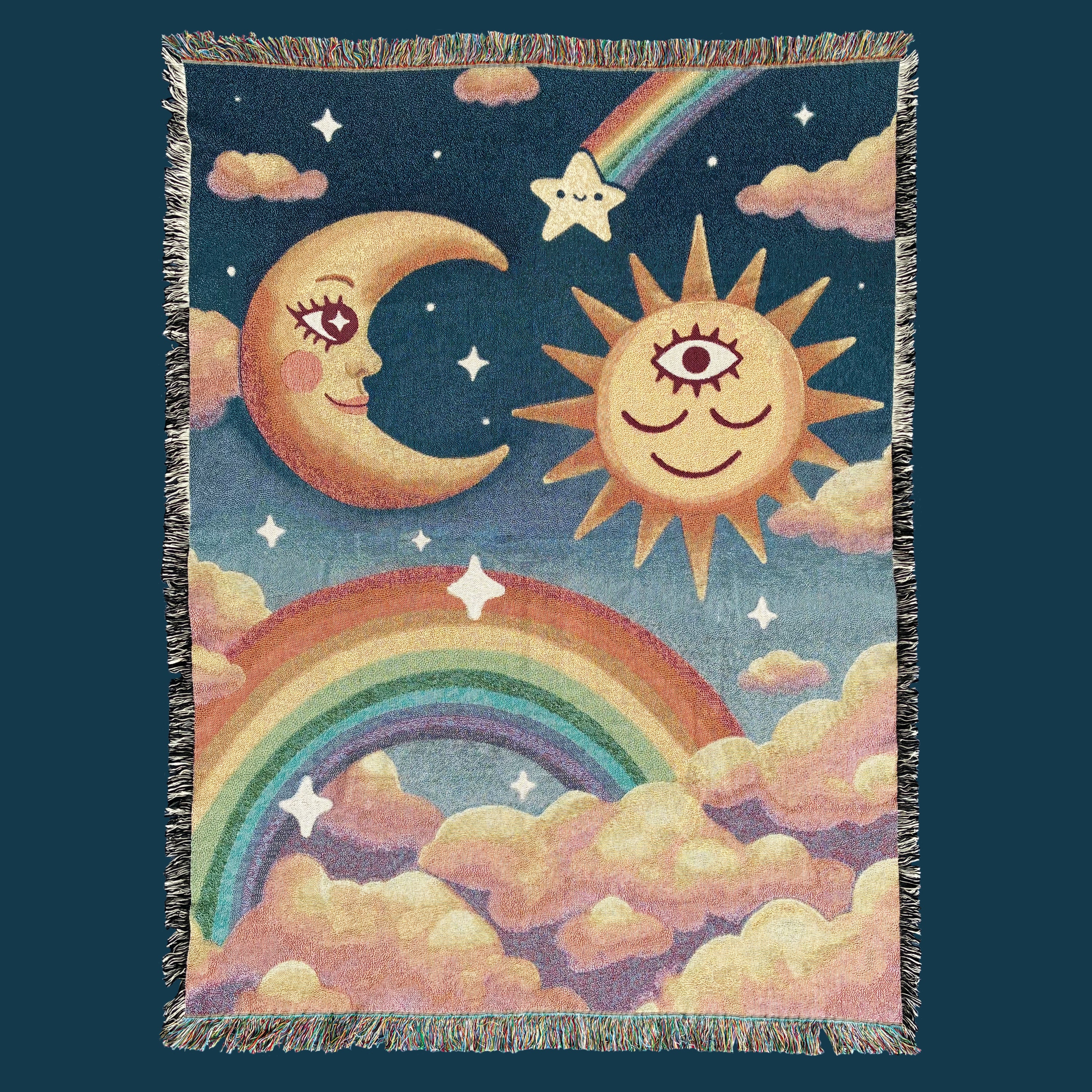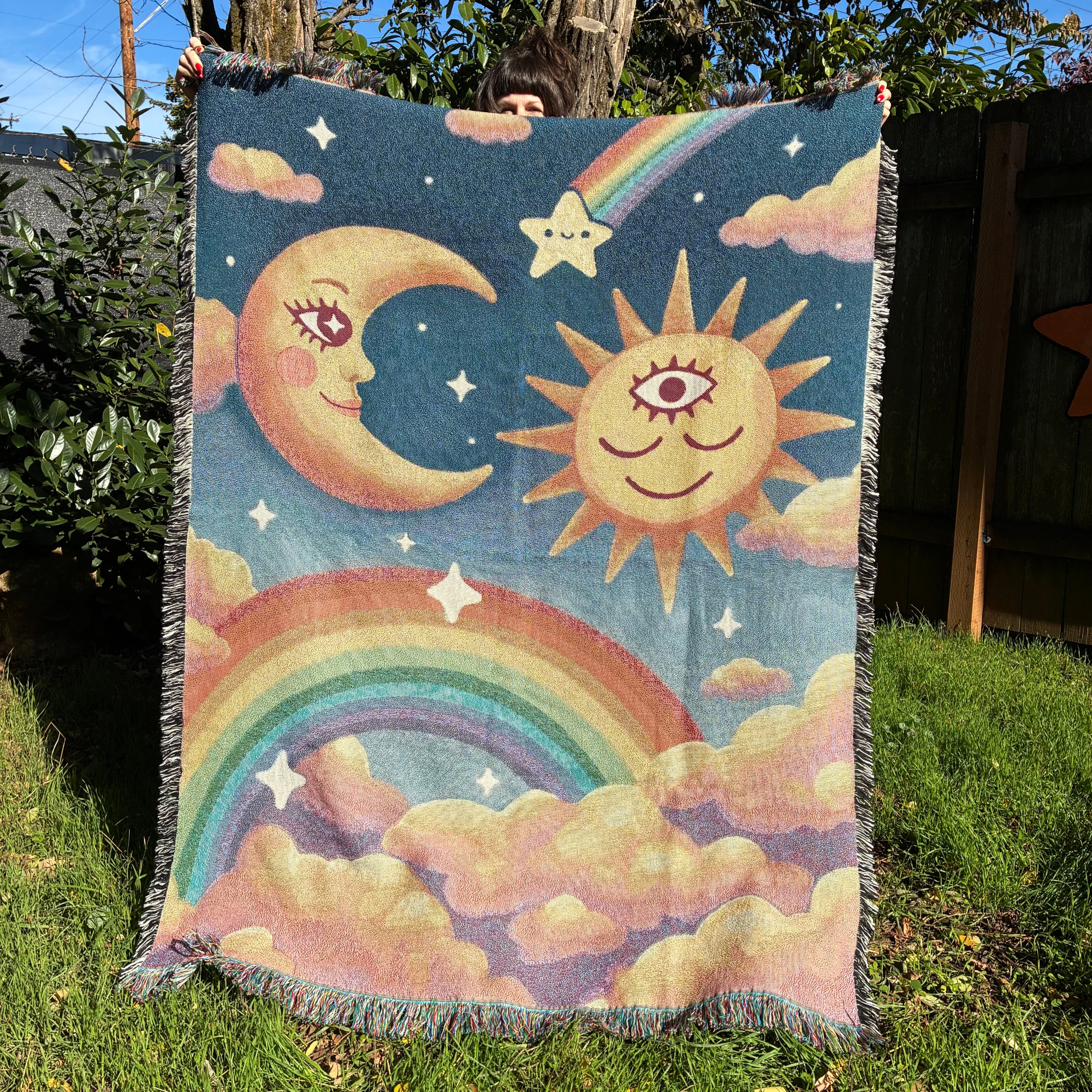 Snuggle into good vibes. This cosmic blanket is woven stardust... moon, sunshine, and rainbow fantasy all dreaming together. Perfect for naps, picnics, or drifting through another dimension. Cuddle up with the cosmos!