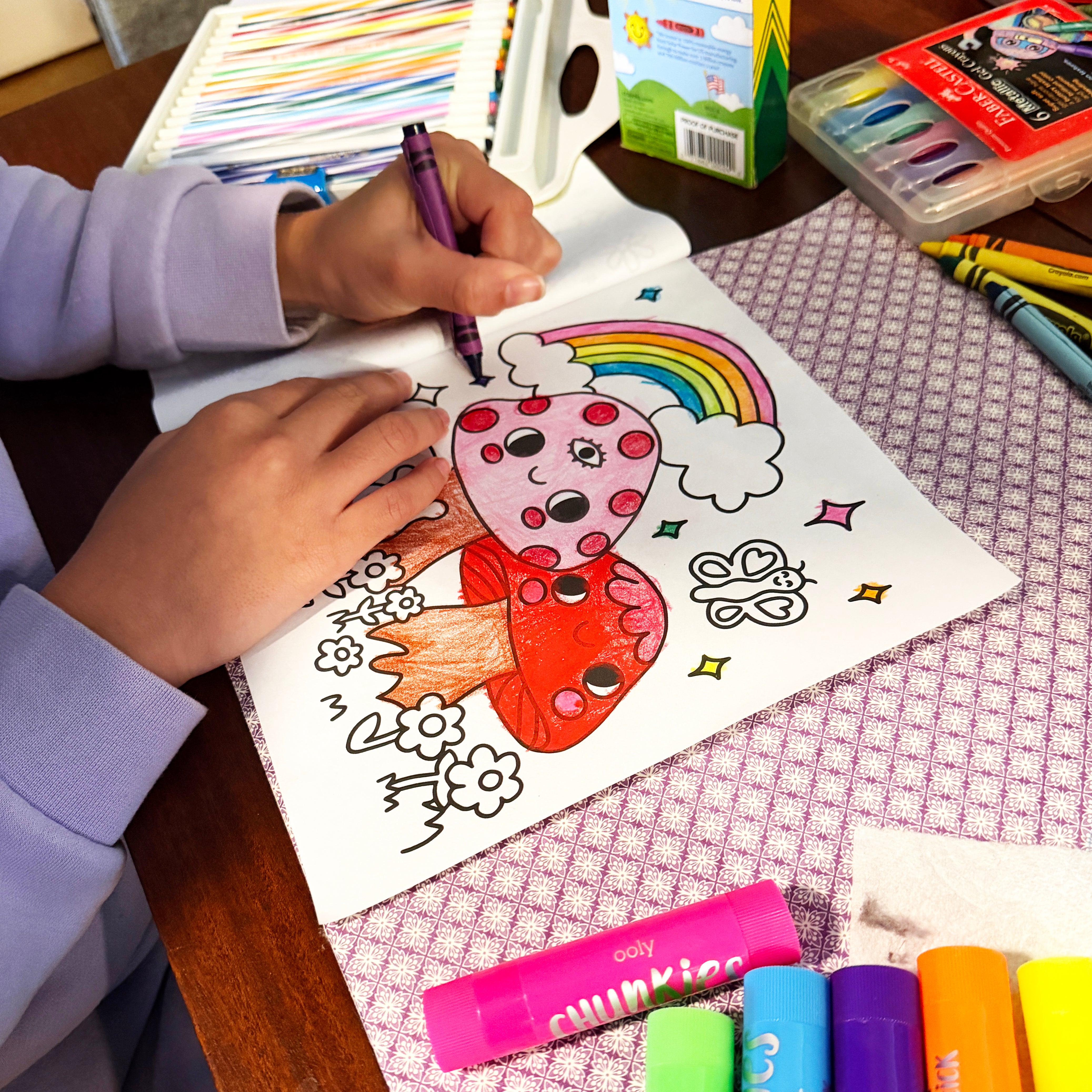 After years of requests I'm soooo excited to release my first coloring book! Here you'll wander into a gentle, whimsical world of cozy characters, mushrooms, stars, rainbows, and everyday magic just waiting for your touch of color!