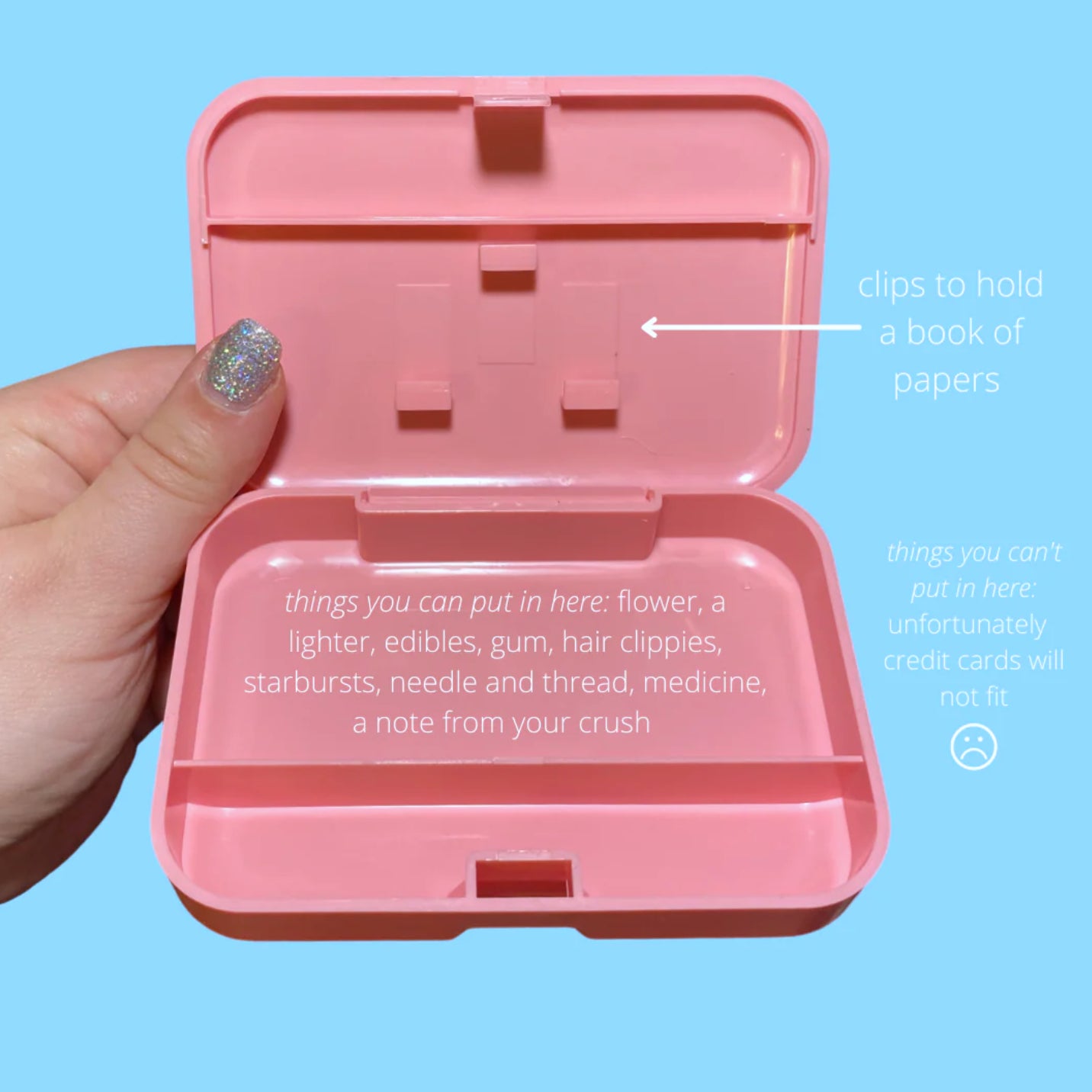 Also a portable, non-squishable container for: gum, starbursts, bobby pins, medication, jewelry, pom pom balls, dog treats, a lighter, tums, erasers, charms, tiny treasures, hopes and dreams .